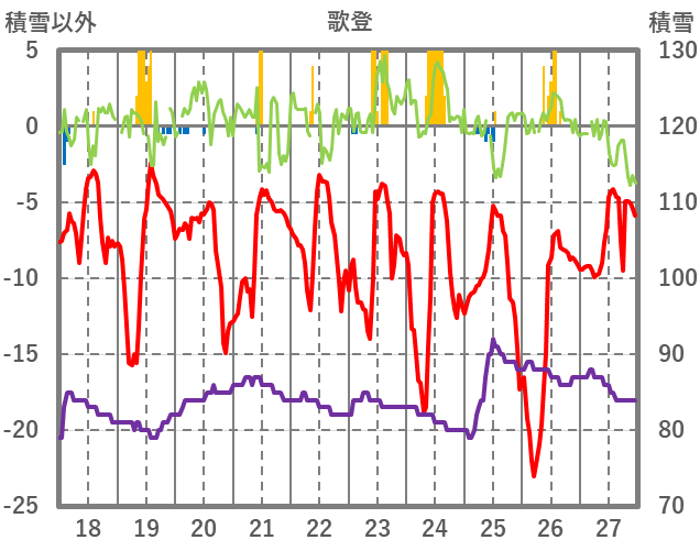 | 日 | 時 | 気温 | 降水 | 風向/風速 | 日照 | 積雪 | 降雪 |