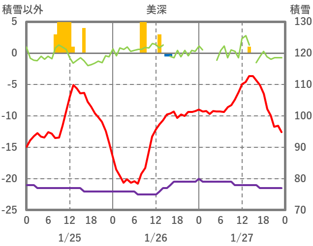 | 日 | 時 | 気温 | 降水 | 風向/風速 | 日照 | 積雪 | 降雪 |