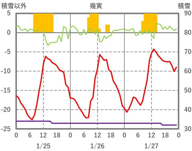 | 日 | 時 | 気温 | 降水 | 風向/風速 | 日照 | 積雪 | 降雪 |