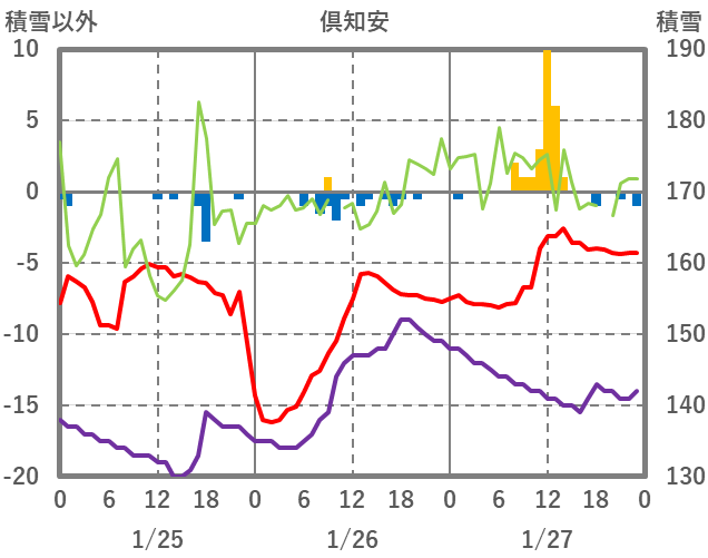| 日 | 時 | 気温 | 降水 | 風向/風速 | 日照 | 積雪 | 降雪 |