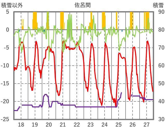 | 日 | 時 | 気温 | 降水 | 風向/風速 | 日照 | 積雪 | 降雪 |