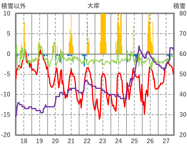 | 日 | 時 | 気温 | 降水 | 風向/風速 | 日照 | 積雪 | 降雪 |