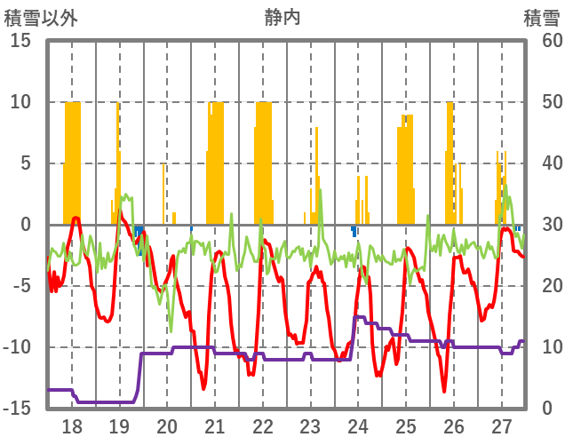 | 日 | 時 | 気温 | 降水 | 風向/風速 | 日照 | 積雪 | 降雪 |