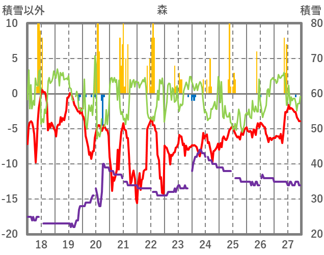 | 日 | 時 | 気温 | 降水 | 風向/風速 | 日照 | 積雪 | 降雪 |