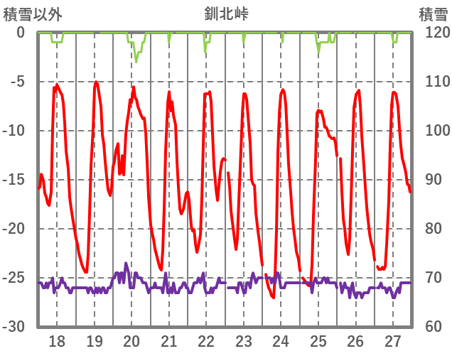 | 日 | 時 | 気温 | 降水 | 風向/風速 | 日照 | 積雪 | 降雪 |