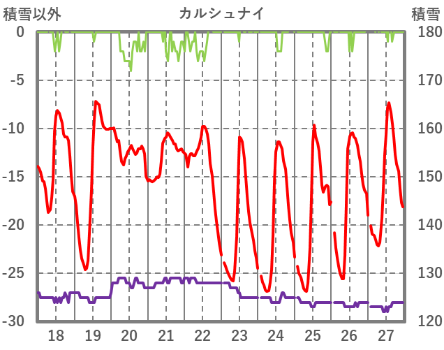 | 日 | 時 | 気温 | 降水 | 風向/風速 | 日照 | 積雪 | 降雪 |
