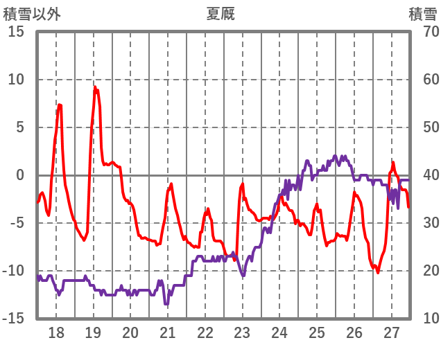 | 日 | 時 | 気温 | 降水 | 風向/風速 | 日照 | 積雪 | 降雪 |