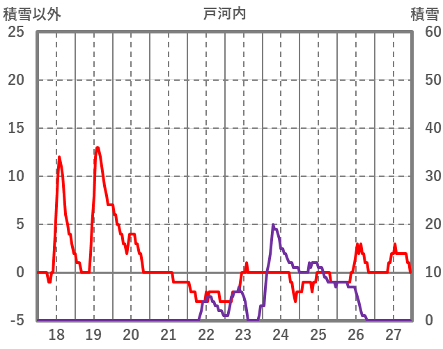 | 日 | 時 | 気温 | 降水 | 風向/風速 | 日照 | 積雪 | 降雪 |