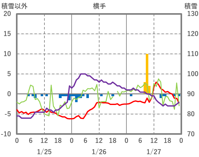 | 日 | 時 | 気温 | 降水 | 風向/風速 | 日照 | 積雪 | 降雪 |