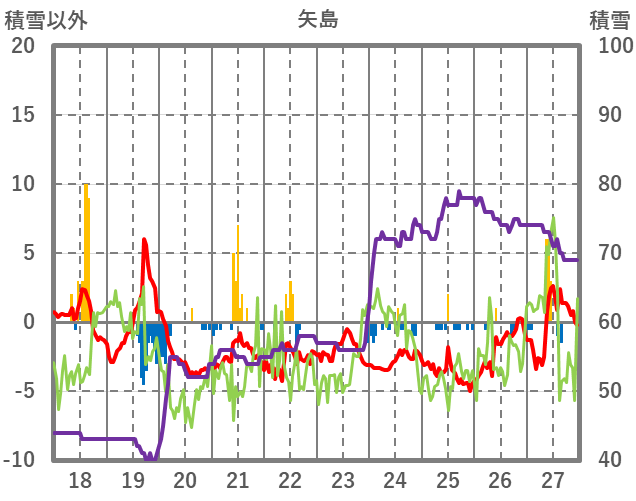 | 日 | 時 | 気温 | 降水 | 風向/風速 | 日照 | 積雪 | 降雪 |