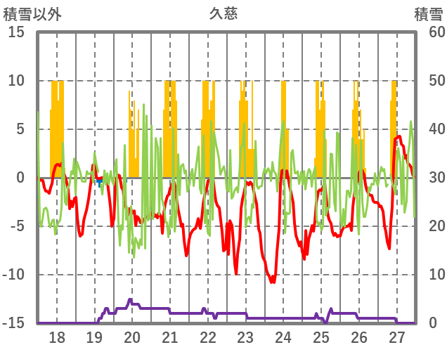 | 日 | 時 | 気温 | 降水 | 風向/風速 | 日照 | 積雪 | 降雪 |