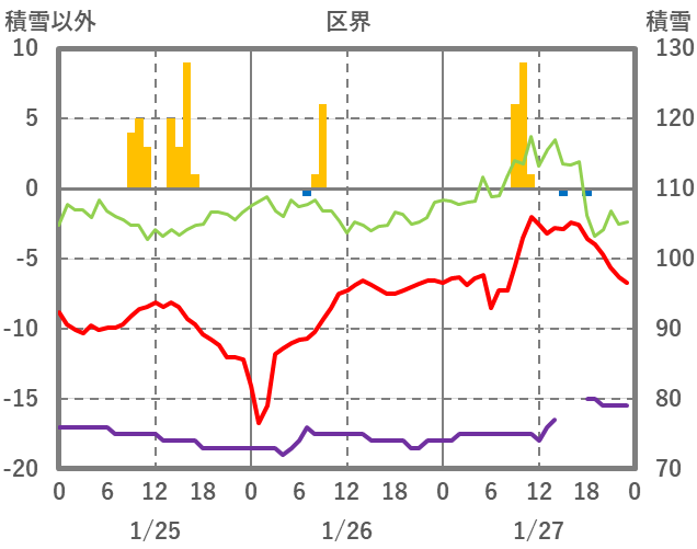 | 日 | 時 | 気温 | 降水 | 風向/風速 | 日照 | 積雪 | 降雪 |