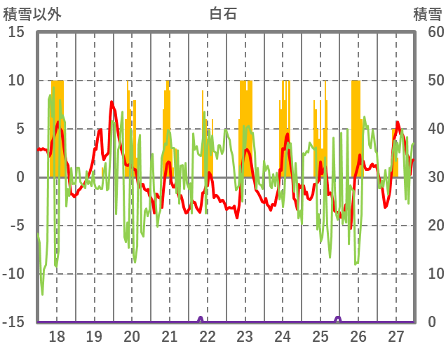 | 日 | 時 | 気温 | 降水 | 風向/風速 | 日照 | 積雪 | 降雪 |