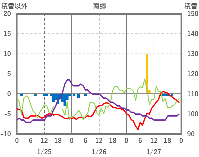 | 日 | 時 | 気温 | 降水 | 風向/風速 | 日照 | 積雪 | 降雪 |