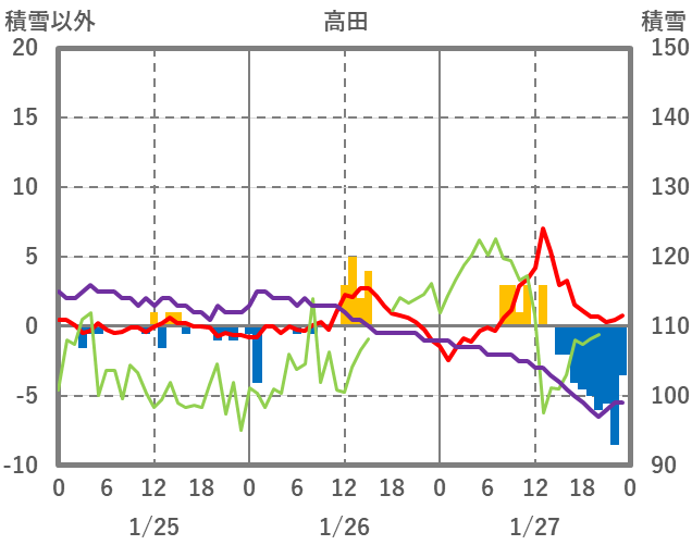 | 日 | 時 | 気温 | 降水 | 風向/風速 | 日照 | 積雪 | 降雪 |