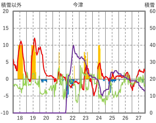 | 日 | 時 | 気温 | 降水 | 風向/風速 | 日照 | 積雪 | 降雪 |