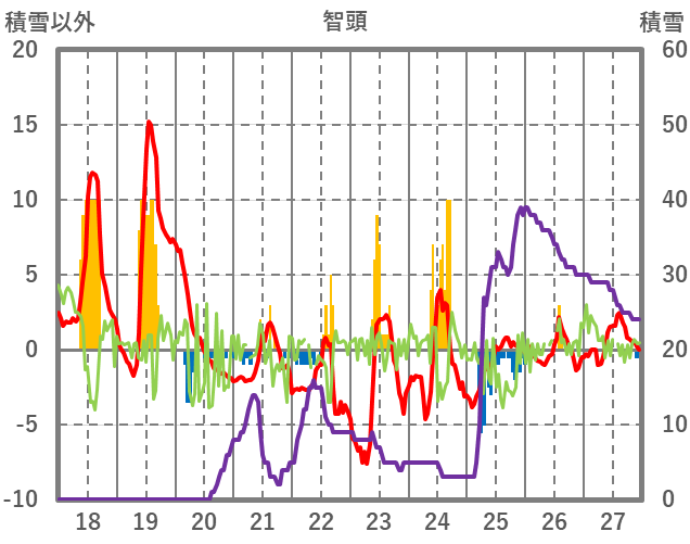 | 日 | 時 | 気温 | 降水 | 風向/風速 | 日照 | 積雪 | 降雪 |
