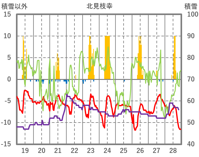 | 日 | 時 | 気温 | 降水 | 風向/風速 | 日照 | 積雪 | 降雪 |