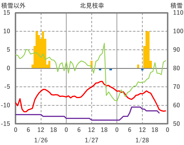 | 日 | 時 | 気温 | 降水 | 風向/風速 | 日照 | 積雪 | 降雪 |