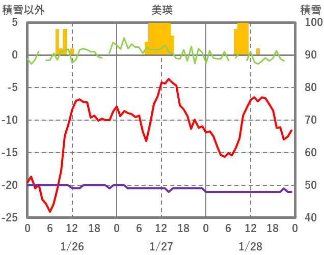 | 日 | 時 | 気温 | 降水 | 風向/風速 | 日照 | 積雪 | 降雪 |