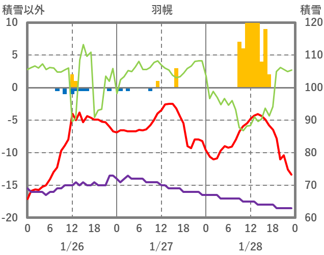 | 日 | 時 | 気温 | 降水 | 風向/風速 | 日照 | 積雪 | 降雪 |