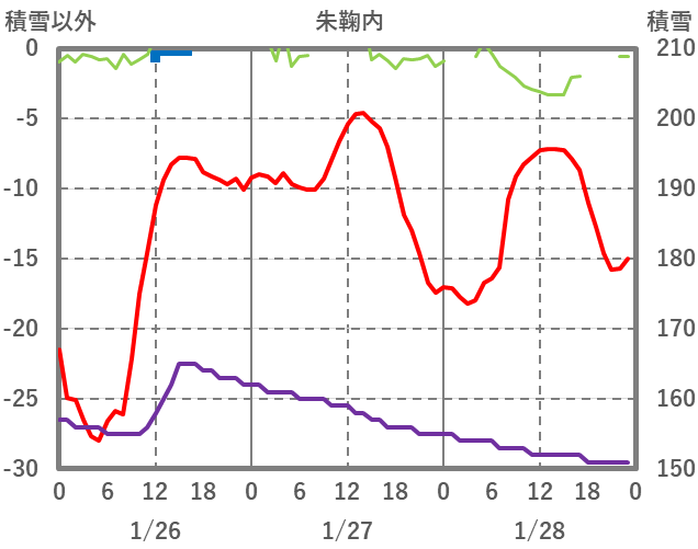 | 日 | 時 | 気温 | 降水 | 風向/風速 | 日照 | 積雪 | 降雪 |