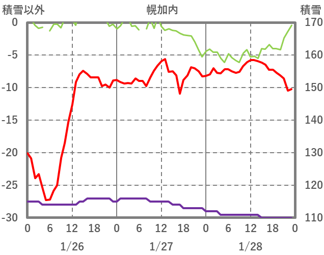 | 日 | 時 | 気温 | 降水 | 風向/風速 | 日照 | 積雪 | 降雪 |