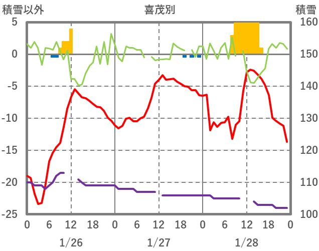| 日 | 時 | 気温 | 降水 | 風向/風速 | 日照 | 積雪 | 降雪 |
