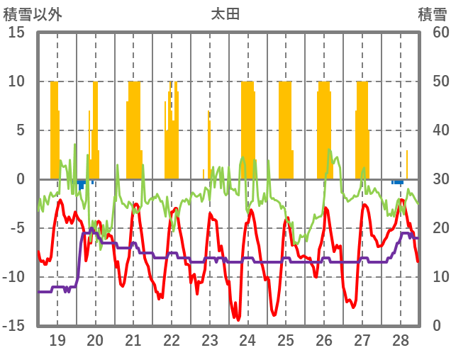 | 日 | 時 | 気温 | 降水 | 風向/風速 | 日照 | 積雪 | 降雪 |