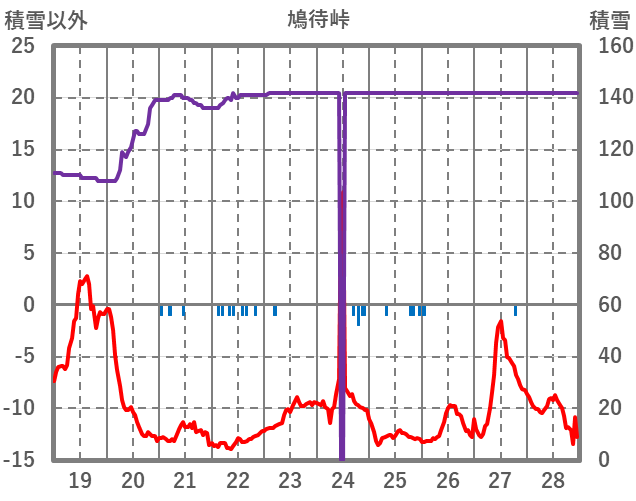 | 日 | 時 | 気温 | 降水 | 風向/風速 | 日照 | 積雪 | 降雪 |