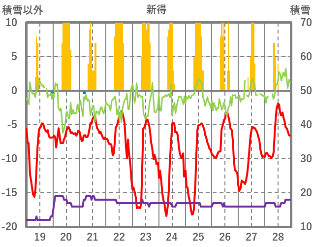 | 日 | 時 | 気温 | 降水 | 風向/風速 | 日照 | 積雪 | 降雪 |