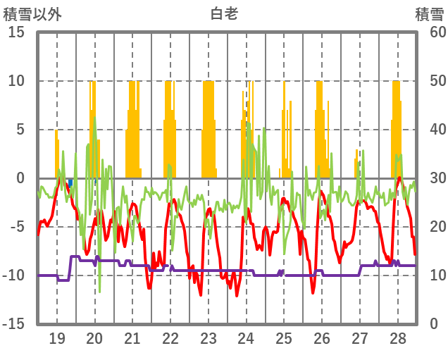 | 日 | 時 | 気温 | 降水 | 風向/風速 | 日照 | 積雪 | 降雪 |
