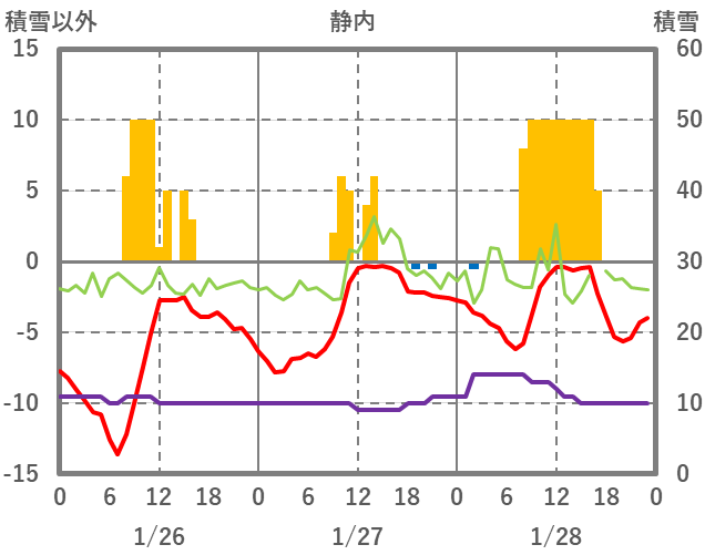 | 日 | 時 | 気温 | 降水 | 風向/風速 | 日照 | 積雪 | 降雪 |