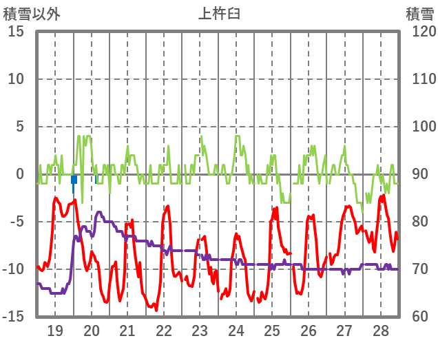 | 日 | 時 | 気温 | 降水 | 風向/風速 | 日照 | 積雪 | 降雪 |