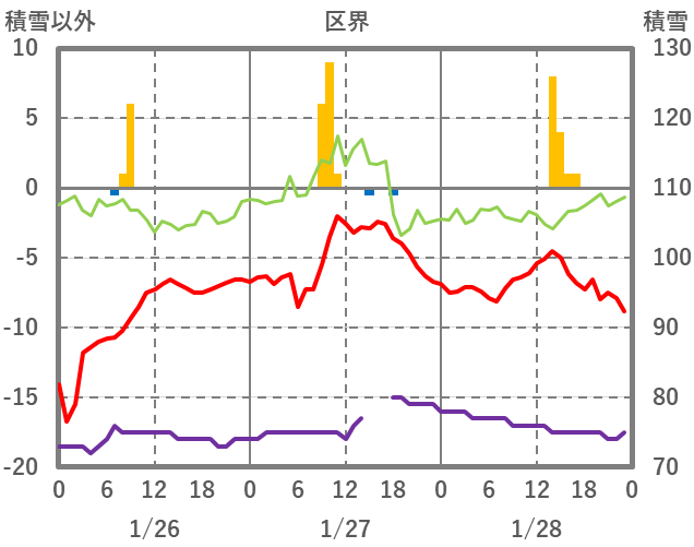 | 日 | 時 | 気温 | 降水 | 風向/風速 | 日照 | 積雪 | 降雪 |