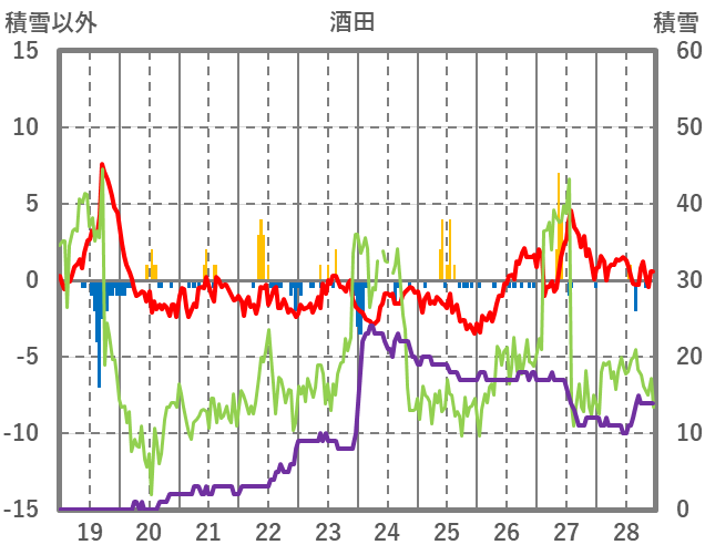 | 日 | 時 | 気温 | 降水 | 風向/風速 | 日照 | 積雪 | 降雪 |