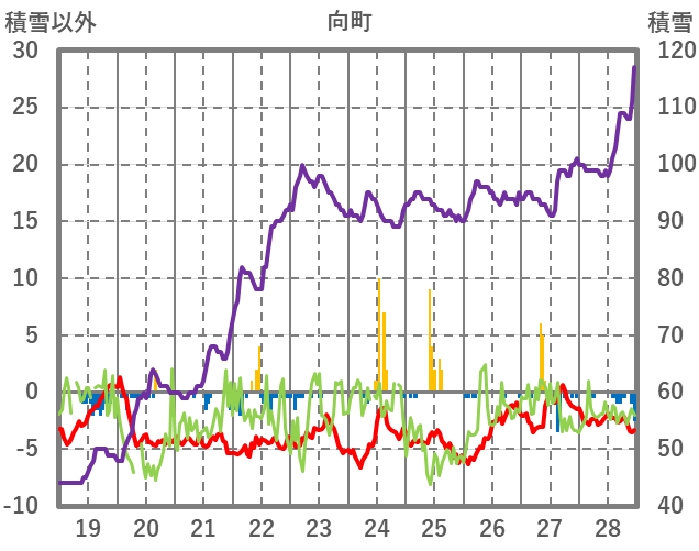 | 日 | 時 | 気温 | 降水 | 風向/風速 | 日照 | 積雪 | 降雪 |