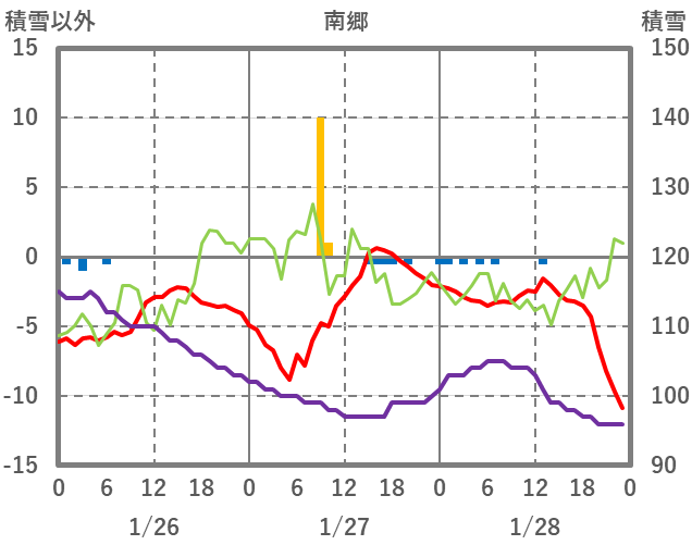 | 日 | 時 | 気温 | 降水 | 風向/風速 | 日照 | 積雪 | 降雪 |
