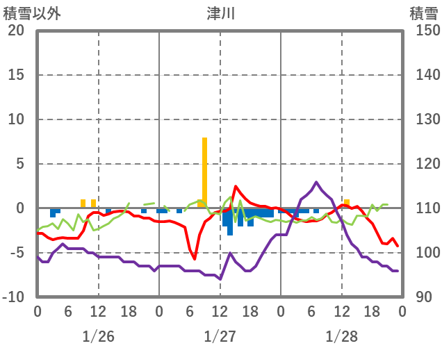 | 日 | 時 | 気温 | 降水 | 風向/風速 | 日照 | 積雪 | 降雪 |