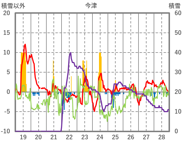 | 日 | 時 | 気温 | 降水 | 風向/風速 | 日照 | 積雪 | 降雪 |