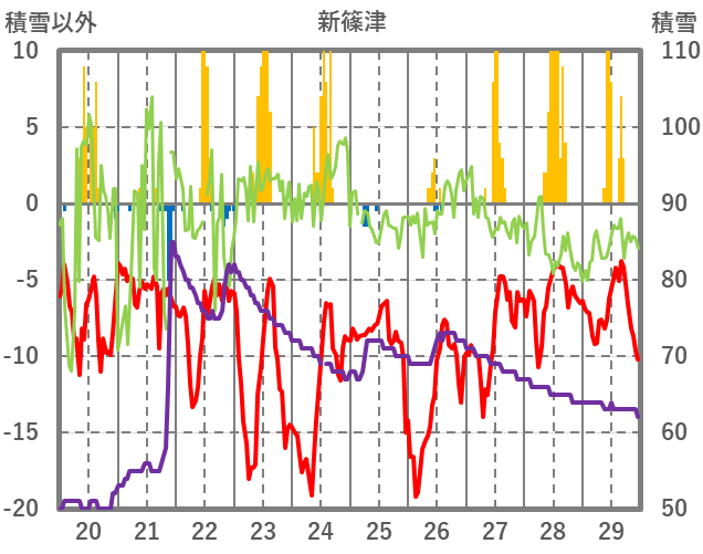 | 日 | 時 | 気温 | 降水 | 風向/風速 | 日照 | 積雪 | 降雪 |
