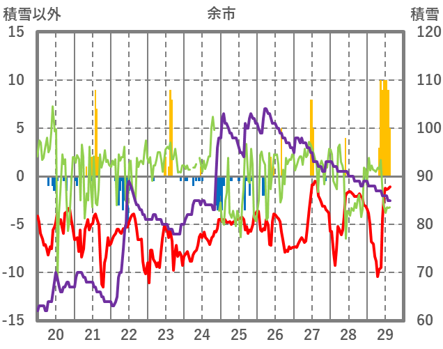 | 日 | 時 | 気温 | 降水 | 風向/風速 | 日照 | 積雪 | 降雪 |