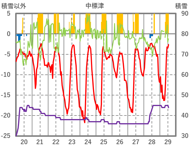 | 日 | 時 | 気温 | 降水 | 風向/風速 | 日照 | 積雪 | 降雪 |