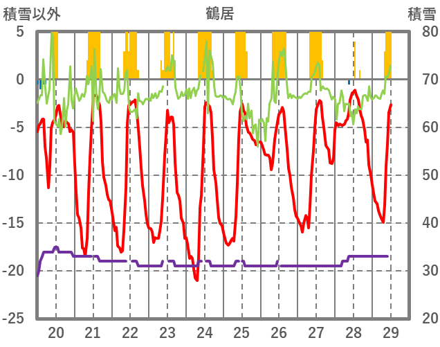 | 日 | 時 | 気温 | 降水 | 風向/風速 | 日照 | 積雪 | 降雪 |