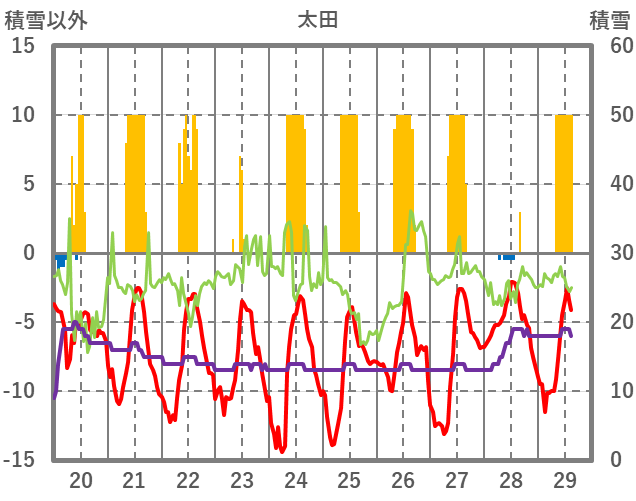 | 日 | 時 | 気温 | 降水 | 風向/風速 | 日照 | 積雪 | 降雪 |