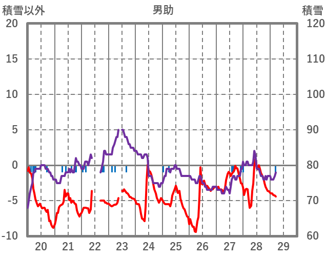 | 日 | 時 | 気温 | 降水 | 風向/風速 | 日照 | 積雪 | 降雪 |