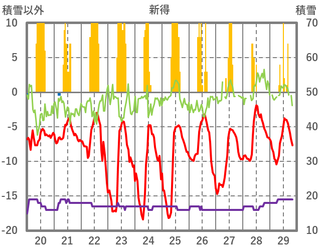 | 日 | 時 | 気温 | 降水 | 風向/風速 | 日照 | 積雪 | 降雪 |