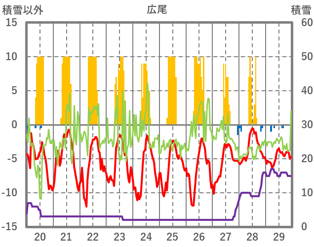 | 日 | 時 | 気温 | 降水 | 風向/風速 | 日照 | 積雪 | 降雪 |