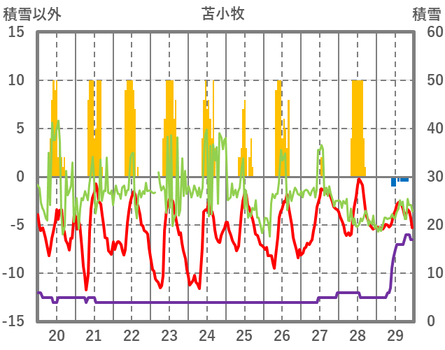 | 日 | 時 | 気温 | 降水 | 風向/風速 | 日照 | 積雪 | 降雪 |