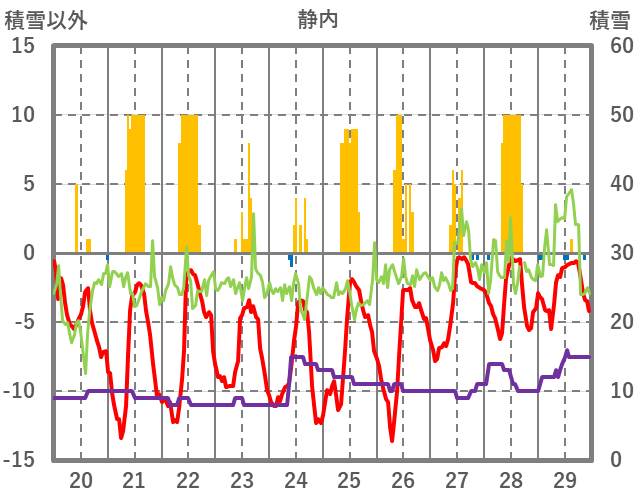 | 日 | 時 | 気温 | 降水 | 風向/風速 | 日照 | 積雪 | 降雪 |